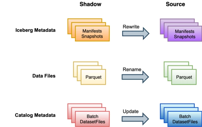 - We rewrite Shadow’s Iceberg metadata with new file and manifest paths; substituting Shadow’s path with that of the Source. All other values are copied verbatim.