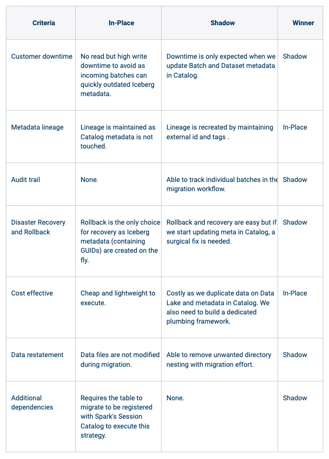 Weighing our options, we decided to choose Shadow Migration instead of the In-Place Migration strategy. Here’s why: