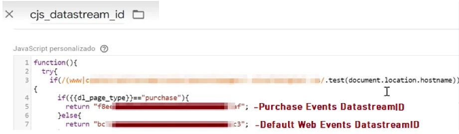 - Custom code in processing layer to dynamically fork purchase events vs. other events to their respective datastream_id. Pre-requisite: “page_type” is captured in customer’s data layer, however it can be any other criteria/type as per your use-case which should be readily available in the data layer.