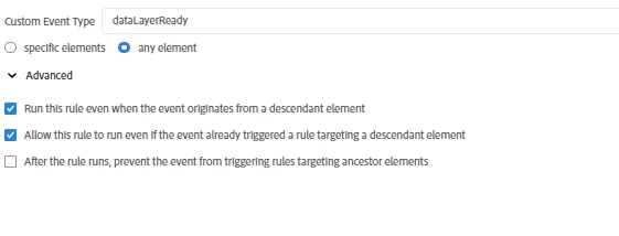 So we had these 2 PageLoad Rules based on the customevent "dataLayerReady" :