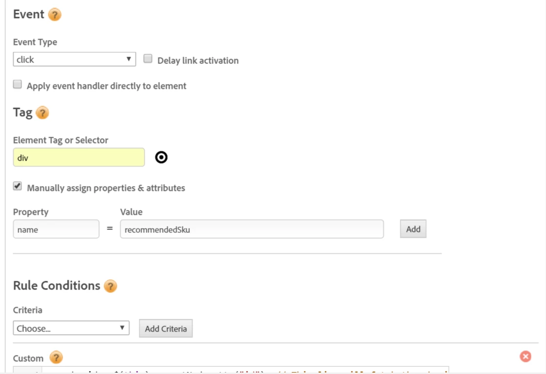 I could use some assistance with passing an ID (or other attribute) value into a Data Element. Specifically, we’ve set up Recommendations using Target, and I’m trying to capture the BrandSKU for the recommendations that are engaging customers on click of the item (or rather the div that contains the item). I’m having some difficulty with setting up the data element capture.