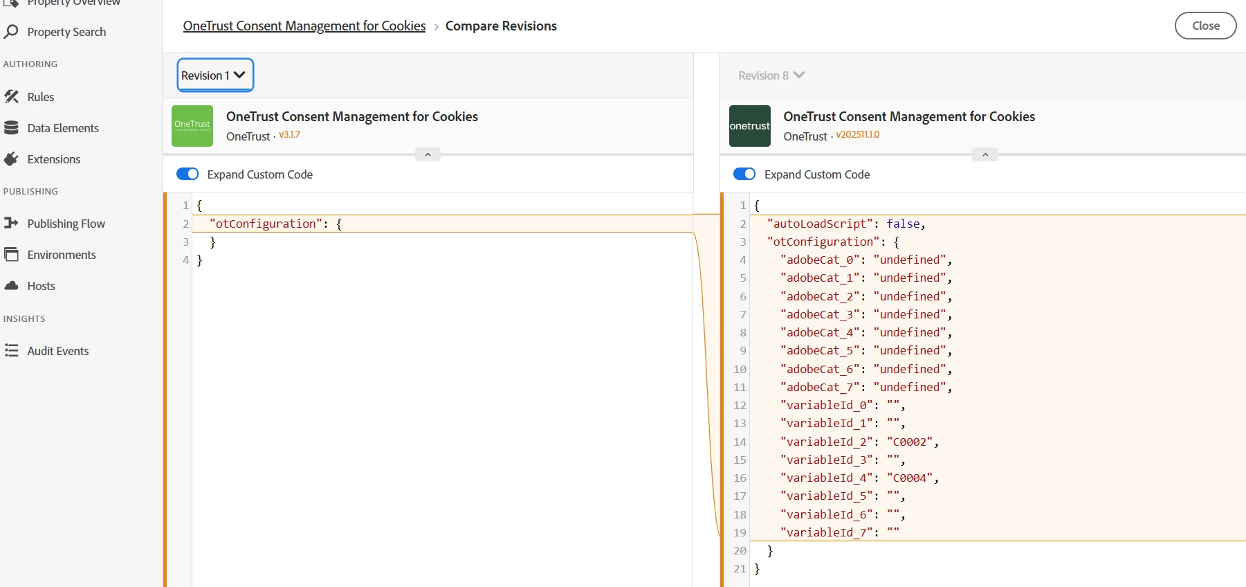 After upgrading the OneTrust extension, the generated configuration now looks like the following: