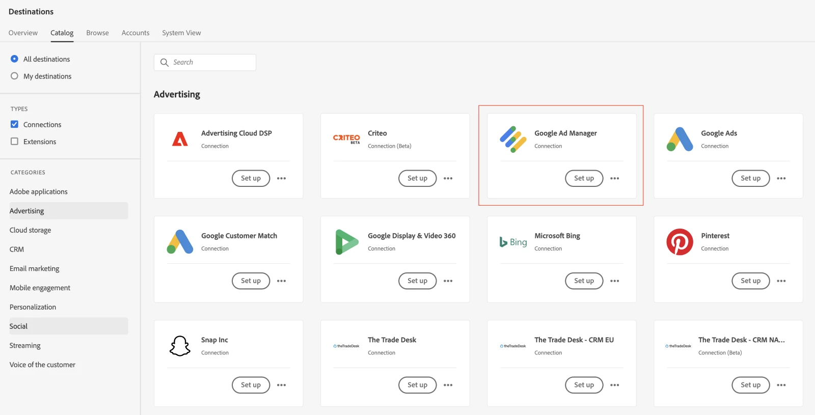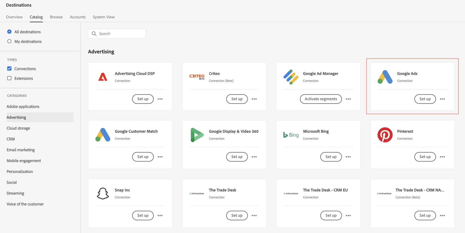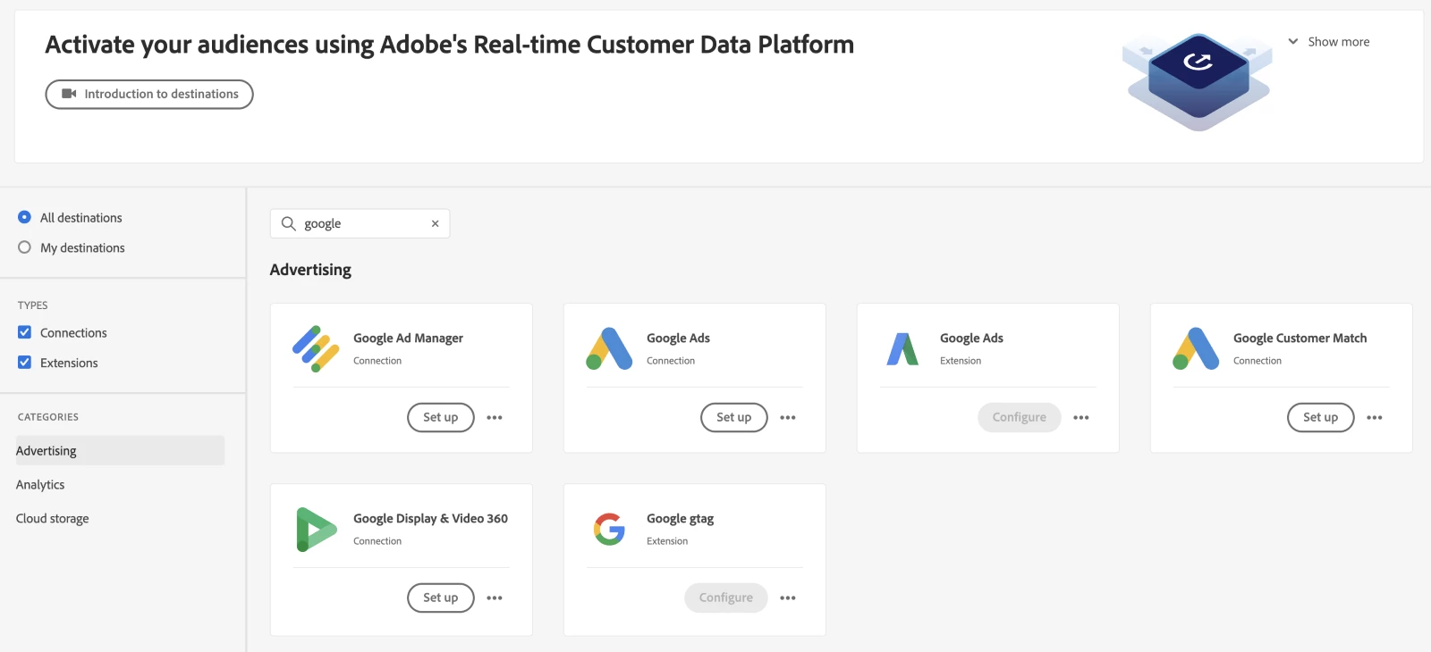 Note: This blog post is exclusively discussing advertising destinations with Google. There are other Google destinations available for cloud storage or analytics as well. Review the catalog to see all destinations currently available.