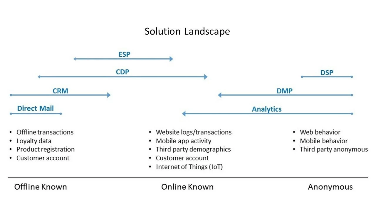 There are several technologies available in the current solution landscape, including CRM systems, DMPs, CDPs, DSPs, ESPs, personalization engines, customer analytics tools, and so on (Figure 4).