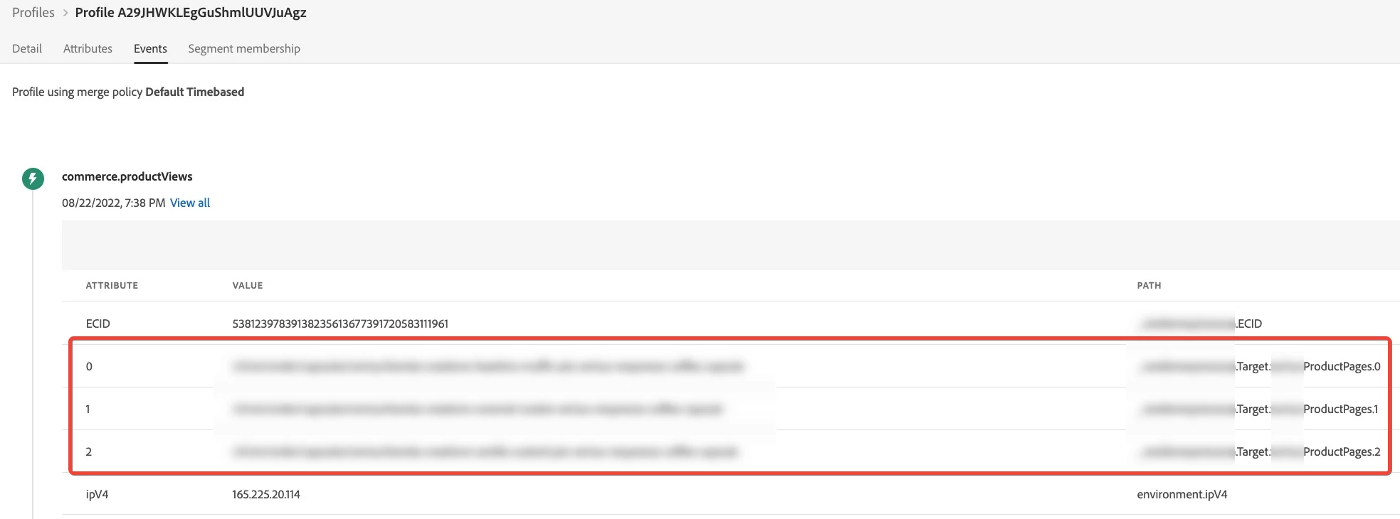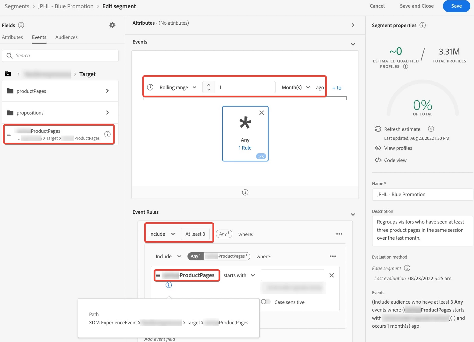 Then I would like to create a realtime segmentation which detects when the XDM Event schema string array contains at least 3 entities in realtime. The idea being to reuse this segmentation on Adobe Target side as an audience to trigger the banner display.