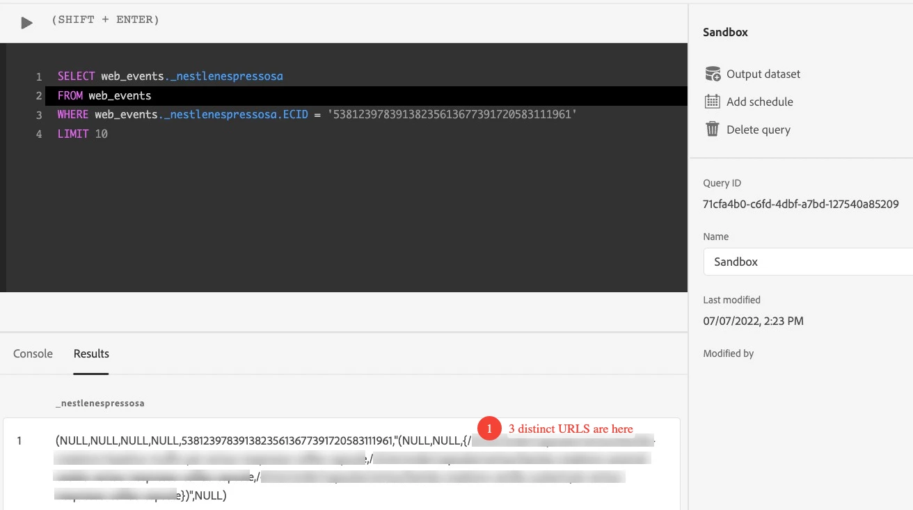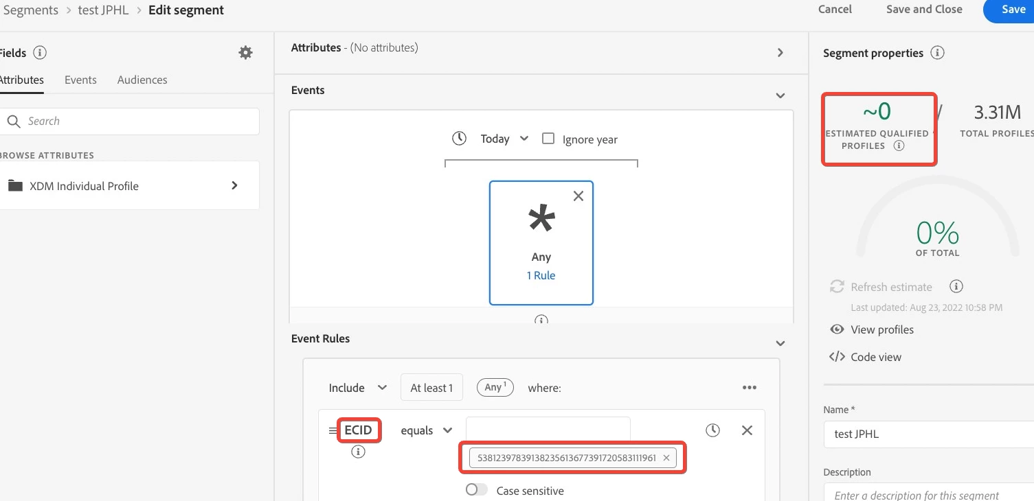 However, the segment is still empty 😕😕 So I counter validated by creating another segment based on the Event related ECID matching both the alloy("getIdentity") feedback in the browser as well as the one being displayed in AEP in the profile section