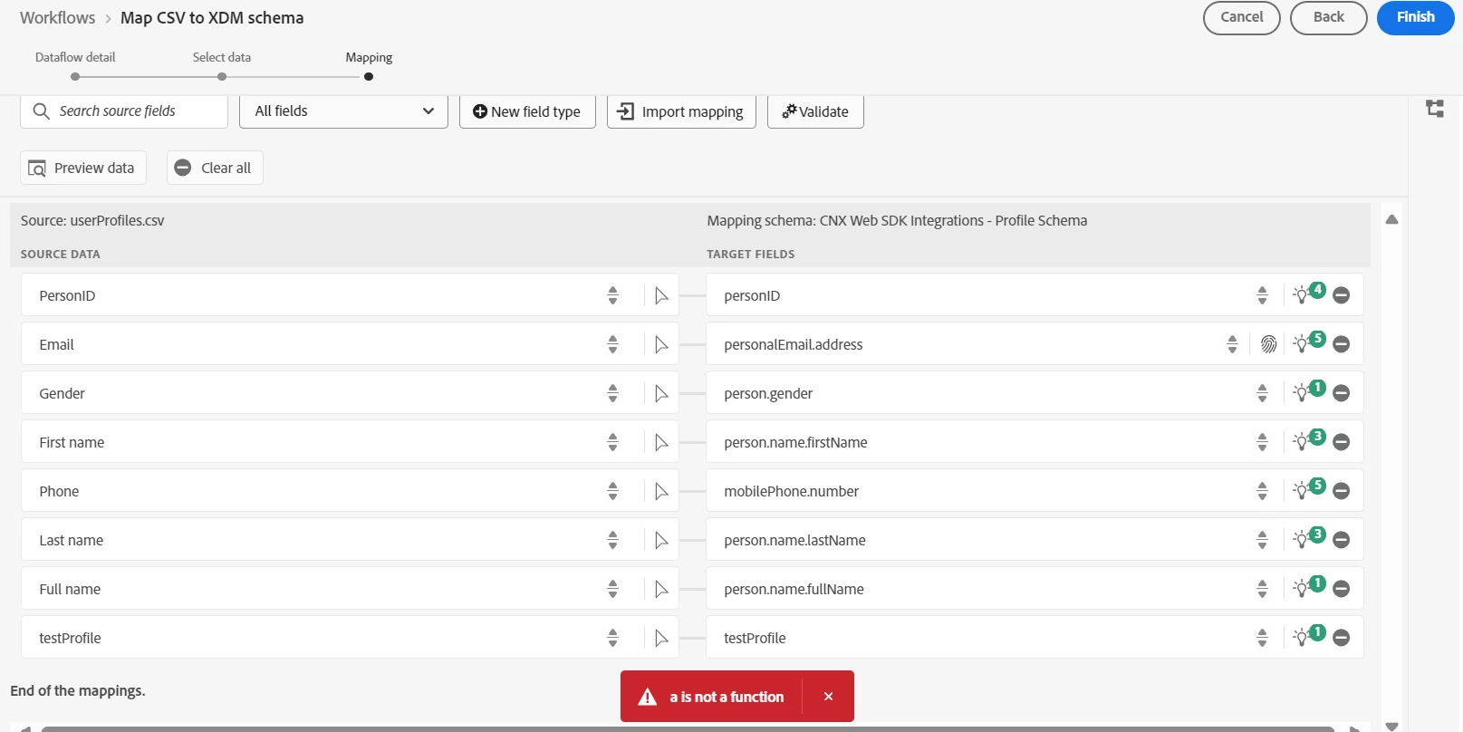 I am trying to upload the "csv" file with profile details and mapping those with profile schema, but am getting error " a is not a function"