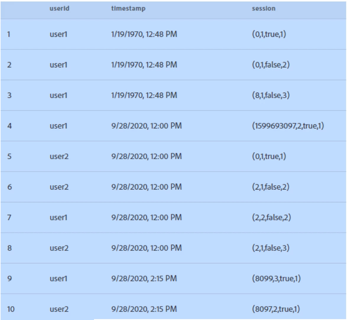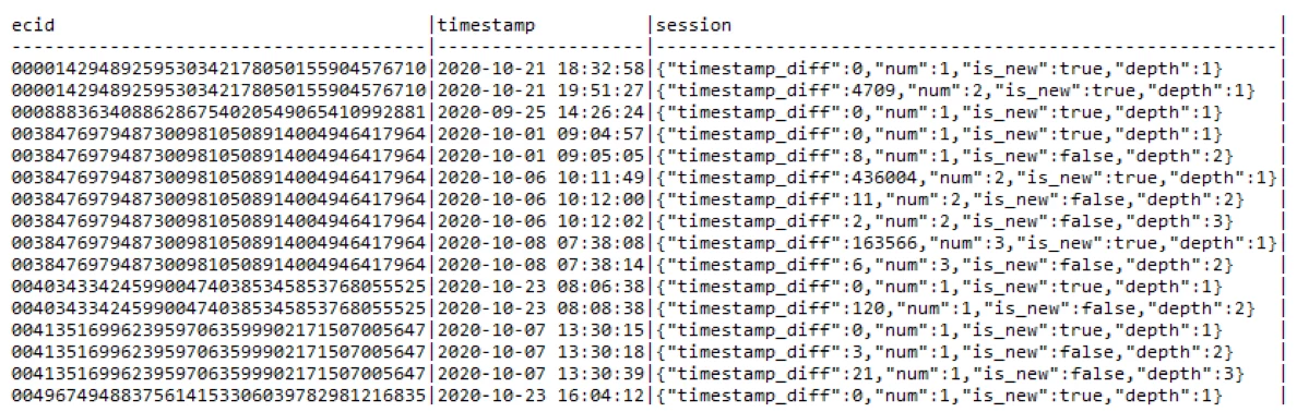 sess_timeout(timestamp, (60 * 30)) OVER (PARTITION BY user_id ORDER BY timestamp ASC ROWS BETWEEN UNBOUNDED PRECEDING AND CURRENT ROW) sessionWhich gives us an output like the rightmost column (in JSON format for easier readability):