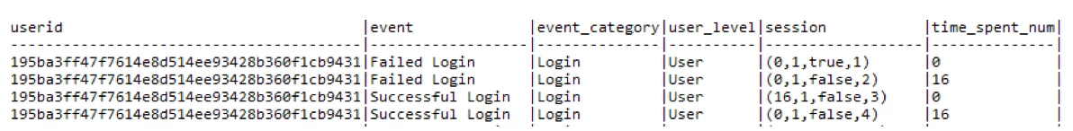 NEXT(session.timestamp_diff,1,true) OVER (PARTITION BY userid, session.num ORDER BY timestamp ASC ROWS BETWEEN CURRENT ROW AND UNBOUNDED FOLLOWING).value "time_spent"We can confirm this is working by looking at the output: