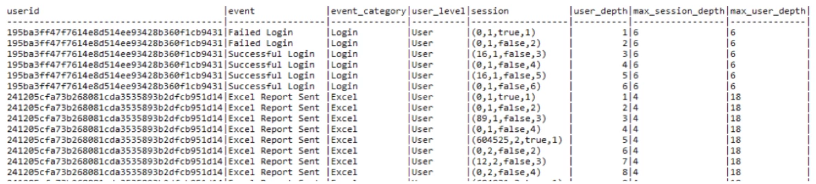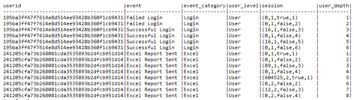 ROW_NUMBER() OVER (PARTITION BY userid ORDER BY timestamp ASC ROWS BETWEEN UNBOUNDED PRECEDING AND CURRENT ROW) "user_depth"This is a new function for us, returning the number of an event relative to the user, thanks to our window function's settings. We get an output like this rightmost column: