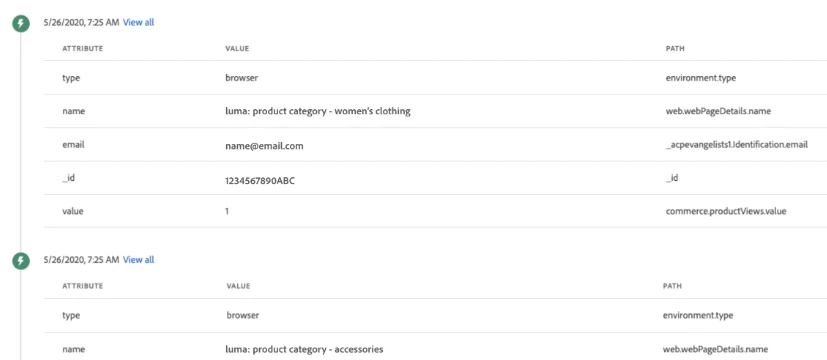- Email clicked, viewed product page, in store purchase, product list adds and checkout