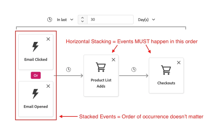 Within the builder canvas, events are represented as tiles that you can link by either stacking them on top of one another, or by linking them side-by-side. When you stack two or more events on the canvas, profiles that include any or all (OR/AND) events that occurred any time within the time range set in the segment. In the example above, a profile must include any of the two email events to be considered for the segment, then a Product List Adds event that occurs after the email events. If we replace the OR logic tying our email events into an AND statement, the definition of this step becomes, “these two events have to happen, and we don’t care what order they happen in.” When the AND statement is changed to THEN, the events will go from being stacked, to being sequenced horizontally, illustrating how events MUST happen in the order defined.