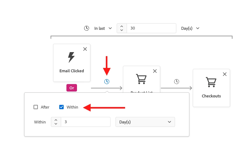 Once you make this change, your description then changes to: (Include audience who have at least 1 Email Clicked event OR have at least 1 Email Opened event then within 3 days have at least 1 Product List Adds event THEN have at least 1 Checkouts event) and occurs in last 30 day(s). As your understanding of customer journeys deepens, time conditions can help translate your insights into very selective, high-value segments.