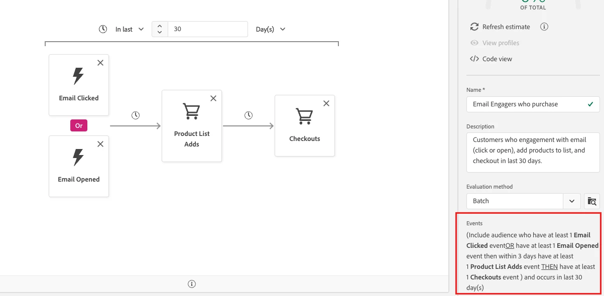 After all the events have been added, the description of this segment is (Include audience who have at least 1 Email Clicked event OR have at least 1 Email Opened event THEN have at least 1 Product List Adds event THEN have at least 1 Checkouts event) and occurs in last 30 day(s). This segment description is available in the segmentation builder UI as well: