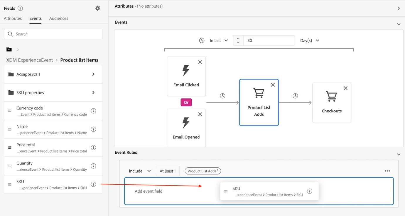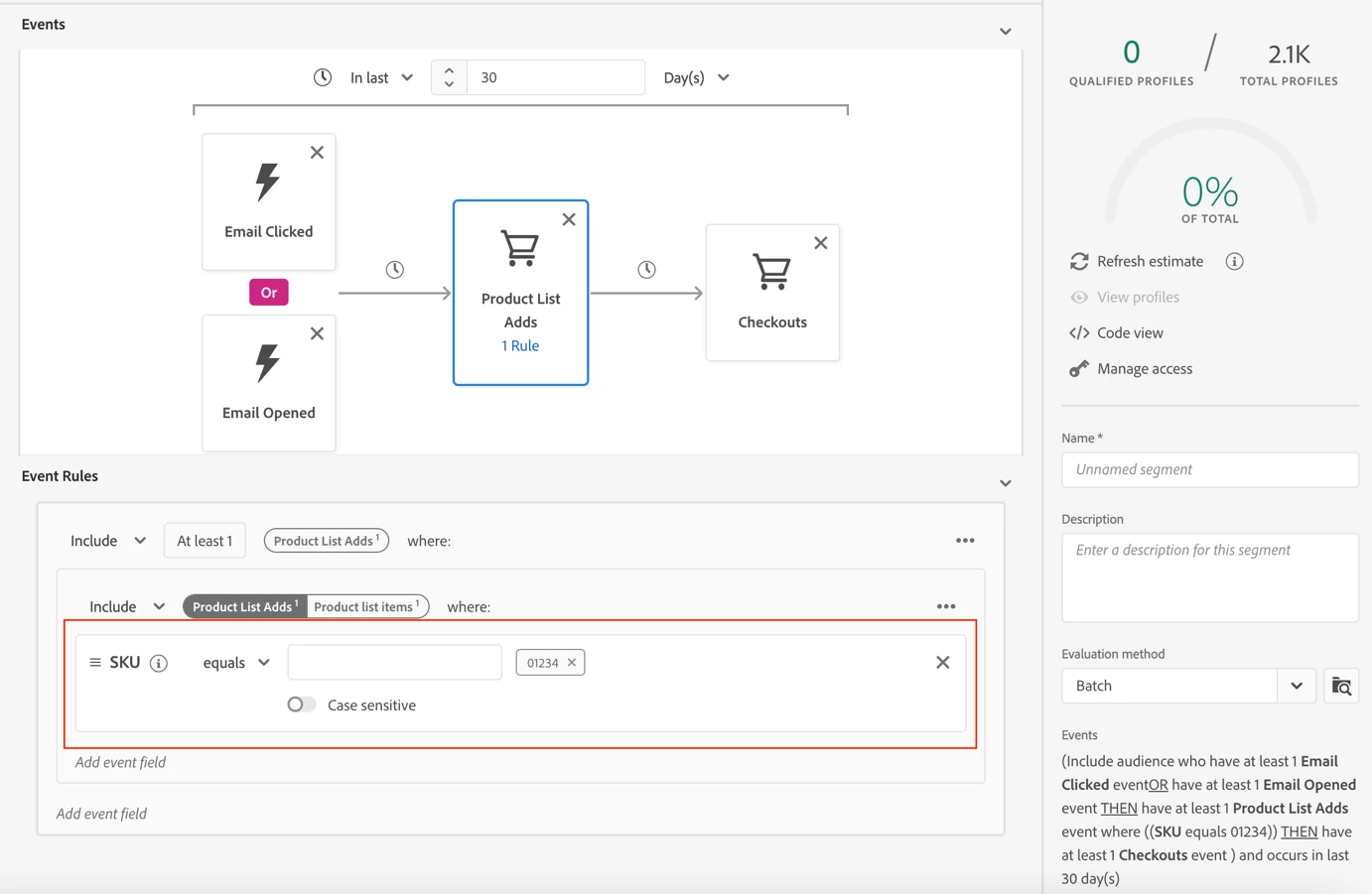 Now our description has changed to (Include audience who have at least 1 Email Clicked event OR have at least 1 Email Opened event THEN have at least 1 Product List Adds event where ((SKU equals 01234)) THEN have at least 1 Checkouts event) and occurs in last 30 day(s); which ensures we’re now requiring profiles to have this specific SKU added to the Product List as part of the journey. You can add multiple event conditions to each event tile, but it’s always important to remember how experience events work and how each condition will operate with the other events included.