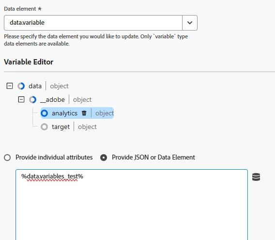 I'm using the Data Object to set eVars to send to Adobe Analytics for reporting purposes. Inside the Data Object, I want to set all the variables using a data element to return a JSON.