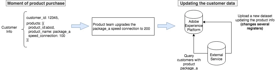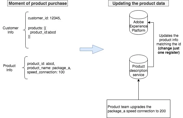 Imagine you are a telco company and you have just upgraded one of your products package connection speed from 100 Mbps to 200 Mbps. One of the teams running email campaigns wants to target clients who have a speed connection under 150 Mbps. In order to not send the wrong campaigns we need to update the product information inside the database, I am seeing two possible approaches: