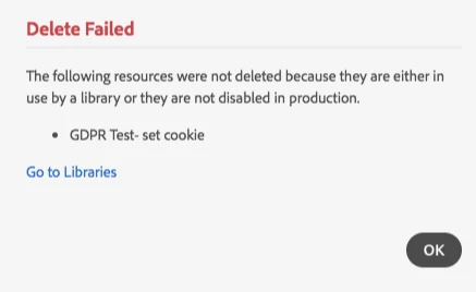 But generally, if I am trying to delete something, it's because I want it to be disabled and removed. I know it's in use by a library, that's what I'm trying to solve for. It would be great if the deletion flow more closely resembled DTM- a deletion counts as a change that needs approval, etc, just like addition/editing changes.
