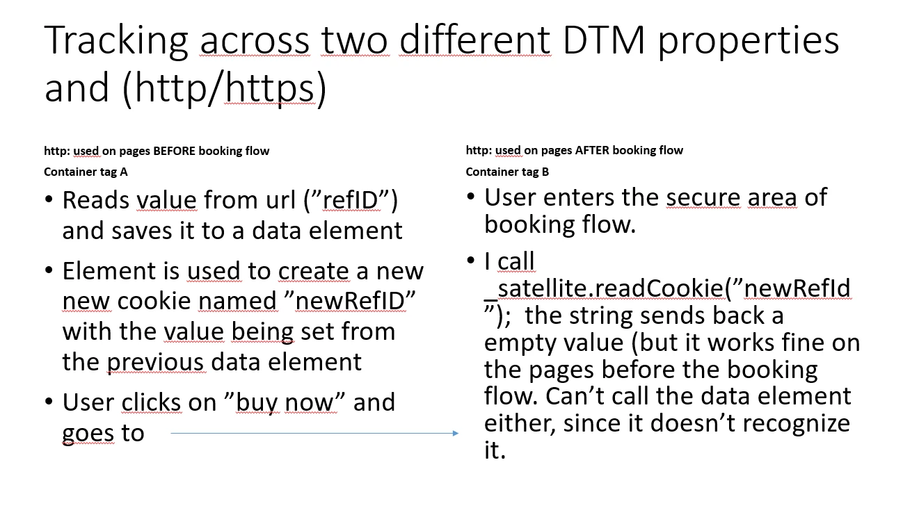 I'm assuming that DTM can hold data values across http and https. But after doing some thorough testing, I can see that an issue occurs when you are going from http to https during your session and at the same time the DTM property changes from "http - dtm property A" to "https - dtm property B". My main objective is pretty simple. Store a value when the user enters the website and use it on the confirmation page. In this example i'm storing from a url parameter. I'm defining the data elements with the url listening function found inside data elements. (this part works).