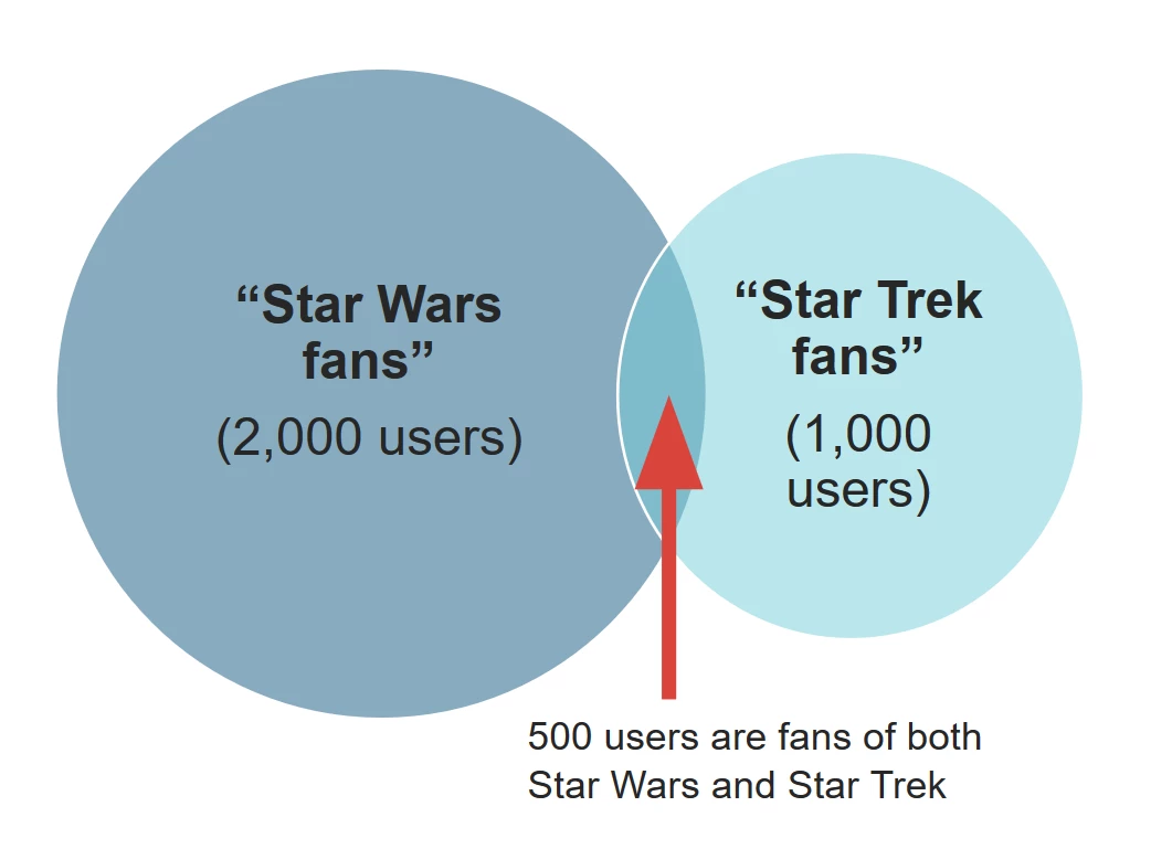 With an overlap report in hand, however, the company would know that 50 of those 100 people are fans of both Star Trek and Star Wars. This means that if they spent $100 on both segments, they would only reach 50 unique users. Instead, the company can spend only $50 on those 50 fans who have a higher chance of clicking on the ad. They can then use the rest of the money to reach more users in other potential segments, such as Guardians of the Galaxy fans.