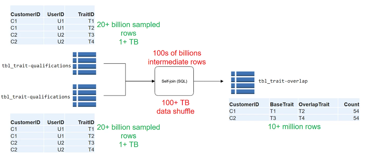 Back in 2016, we used Amazon Redshift to run our overlap query. The trait-qualification table for Amazon redshift at the time had around three trillion rows with a retention of 60 days and 60+ TB of data. To optimize query performance for overlap processing, we statistically sampled the data down to 20 billion rows. But with Amazon Redshift, each self-join generated billions of intermediate rows and hundreds of TBs of data. (See figure below.)