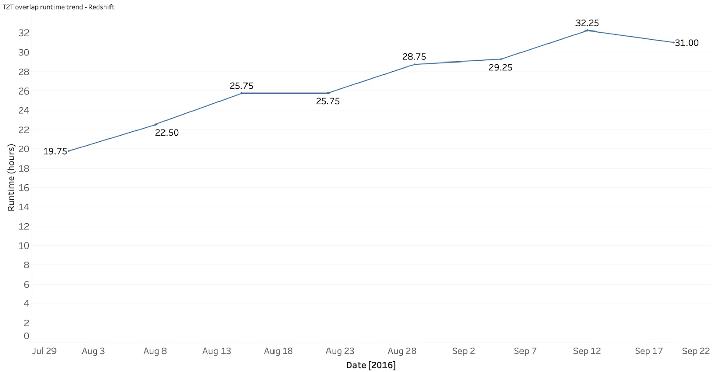 As shown in the graph, the query time for overlap reports on the 18-node Amazon Redshift cluster steadily increased from 19.75 hours in July to 31 hours in September. To add insult to injury, if a failure occurred after 30 hours we had to restart the query and wait almost two additional days of runtime. By then, the customer's SLA had likely expired.