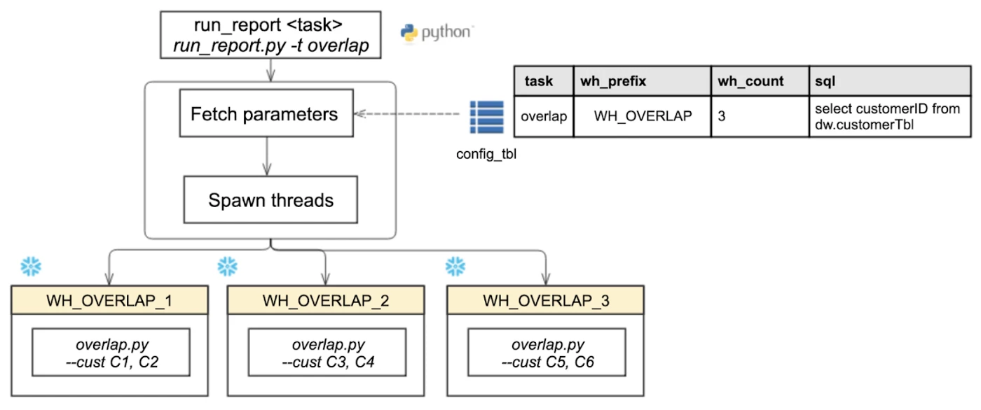 In this new workflow, we built a new wrapper script called run_report and configured it so we could scale the cluster simply by entering the number of warehouses we want to spin. The script then spins the warehouses and distributes the data across them.