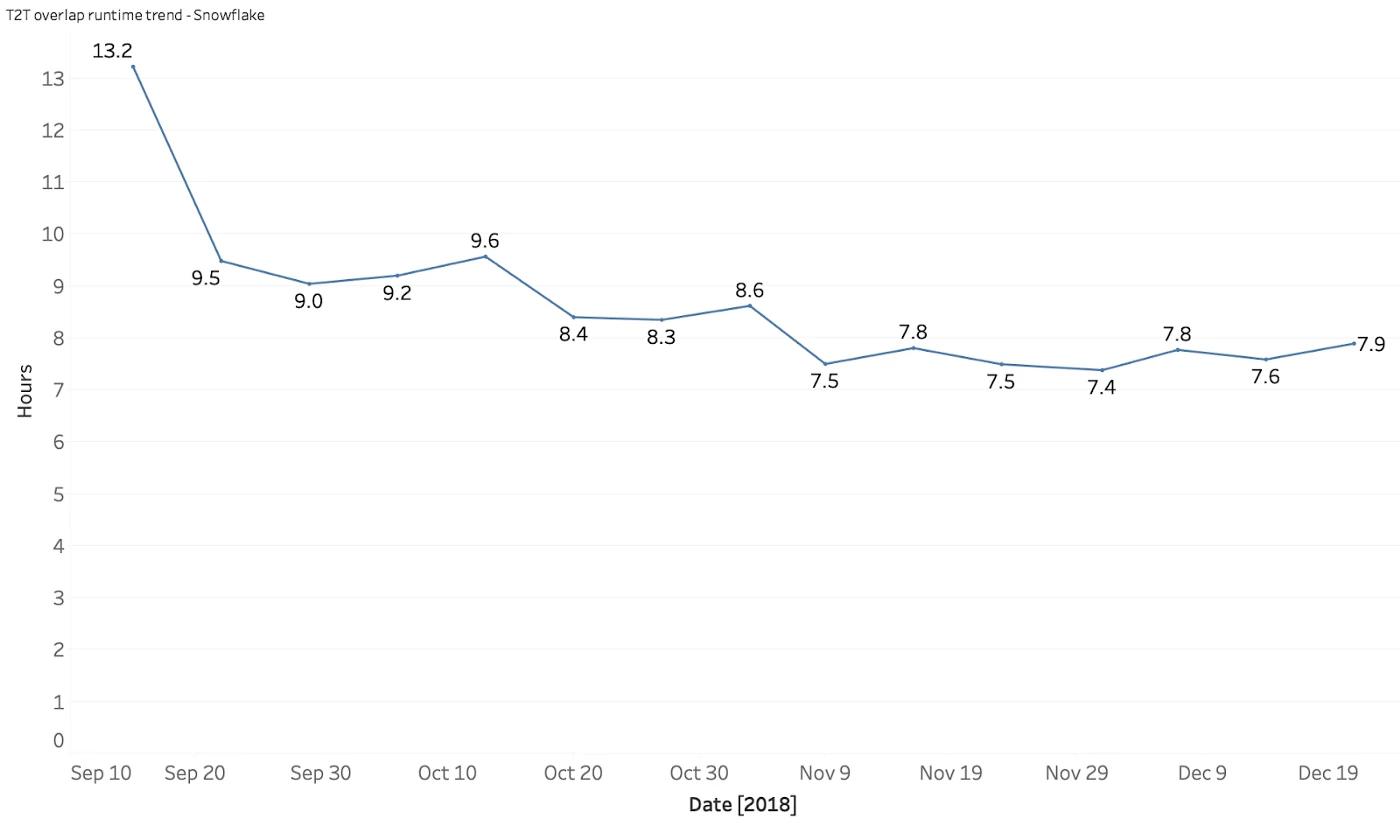 Instead of running a single-threaded self-join on 20 billion rows, in Snowflake the data is split between two warehouses where both queries are run in parallel. This more than halves the amount of intermediate data and noticeably improves query performance. As a result, query times fell from 31 hours to only 8 hours.