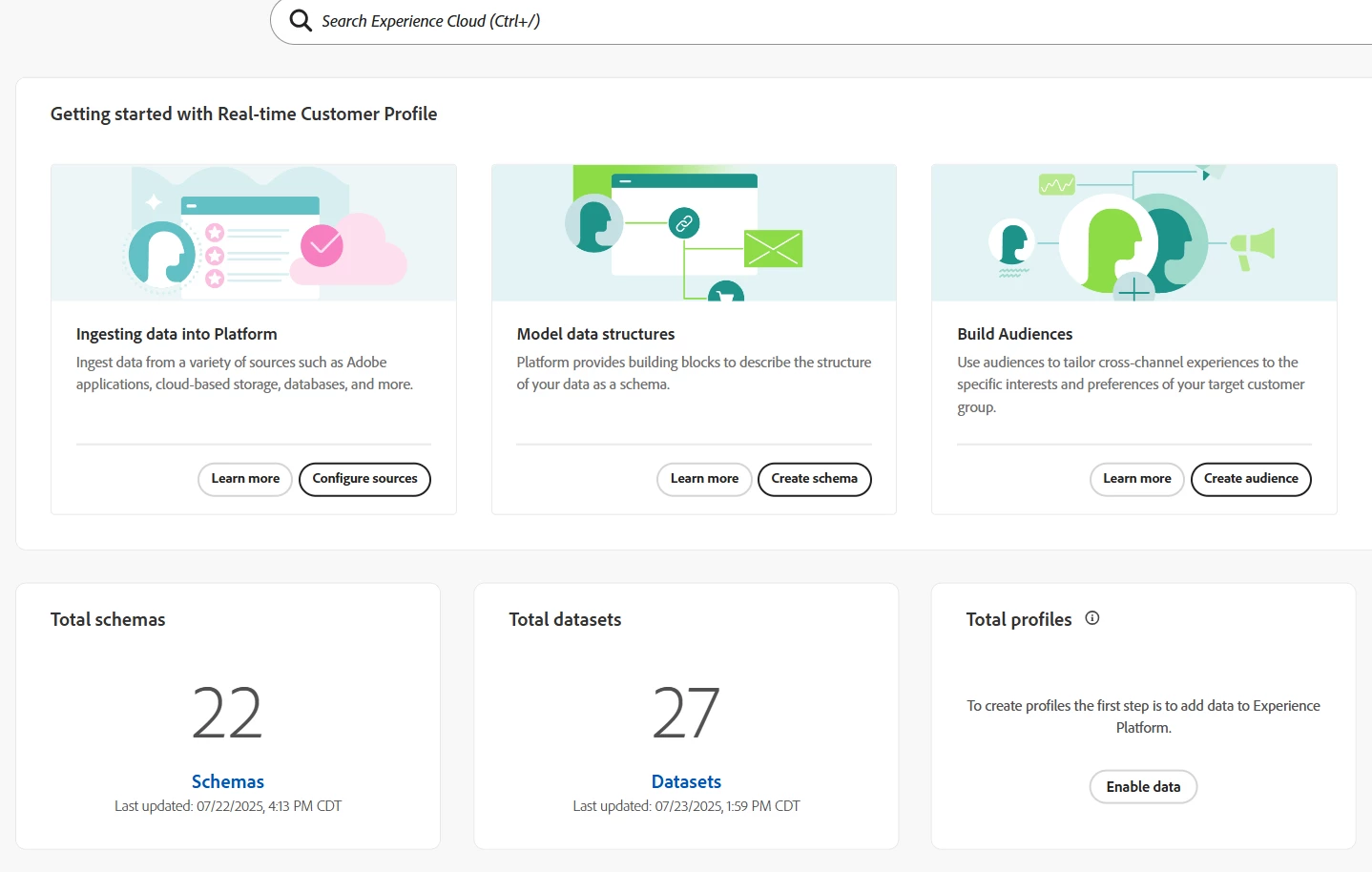 I’m working in AEP and noticed that the total profile count is not showing on the Home dashboard or the Profiles > Overview page, even though: