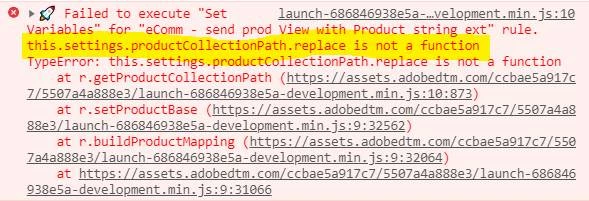 We are trying to generate “s.products” Adobe Analytics variable using AA Product String Builder via Launch. Unfortunately I am getting below errors on console.