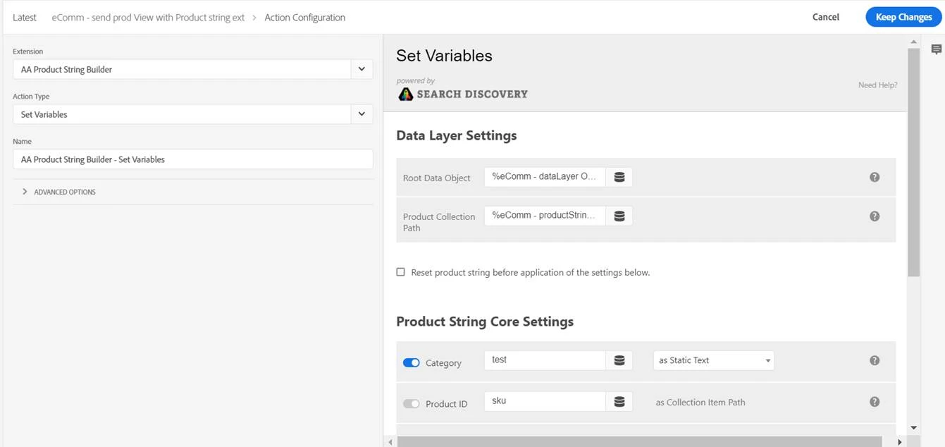 2. Action configuration for AA Product String Builder.