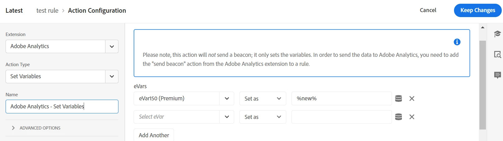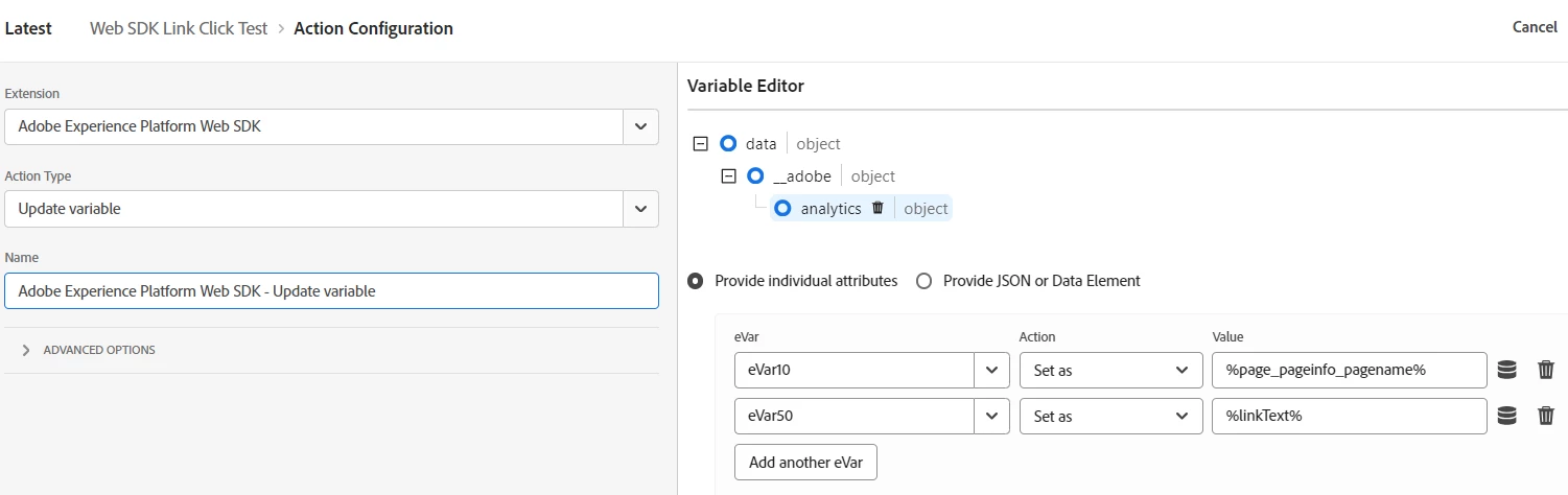 Then I am using percent (%) syntax reference this in AEP web SDK update variable type as shown below in eVar50