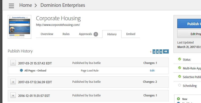 The version history in DTM for published containers is great but I'd love to see DTM Launch have Version Control for code changes when you "save" a rule without publishing the container.