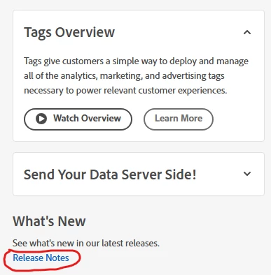 In the right side area of the Tags > Properties screen there is a What’s New section with a Release Notes link that points to the following URL, but there is no AEP Data Collection Tags info on that page.