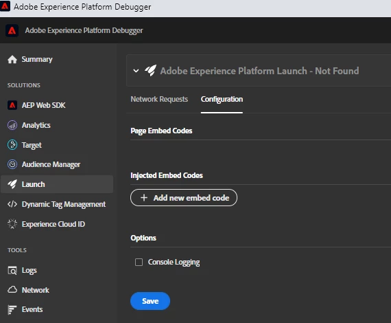 , the embedded code should appear in order to be replaced but it doesn't; it's even worse, Adobe Experience Platform Debugger doesn't allow me to add a new one since it doesn't find Adobe Experience Platform Launch: