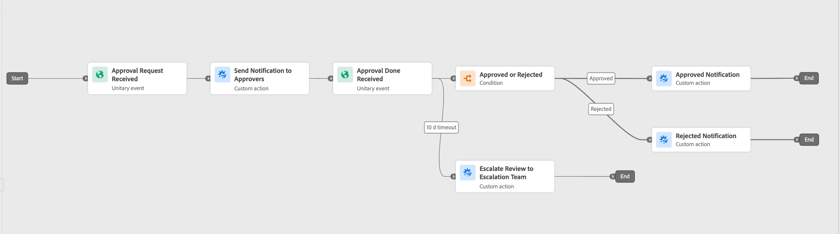 - Event Activity: The "gatekeeper" in your journey. It's configured to wait for your specific approval event and has a built-in timeout path if the event doesn't arrive on time.