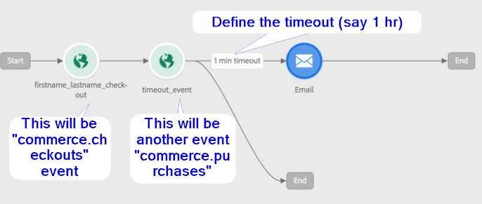 I found out that instruction - https://experienceleague.adobe.com/docs/commerce-merchant-services/data-connection/use-cases/using-ajo.html?lang=en#create-a-timeout-event
