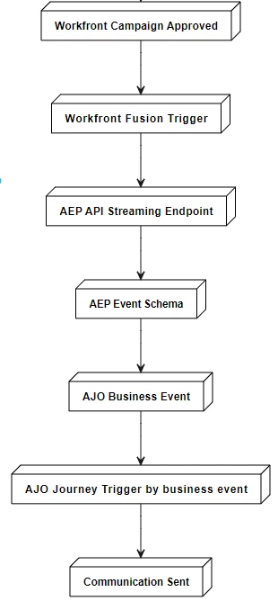 - Workfront Fusion and AEP Integration: Workfront Fusion comes into play by triggering an AEP API streaming endpoint, which adds the campaign project approval status to the event schema of a non-people-based primary identity in AEP.