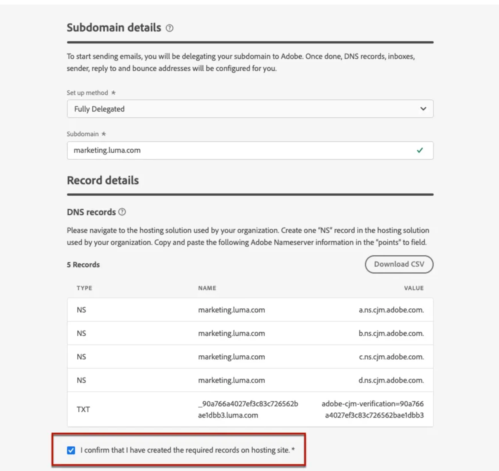 When delegating the subdomain marketing.luma.com using NS Delegation, Adobe Journey Optimizer (AJO) provides the following DNS records in the UI: