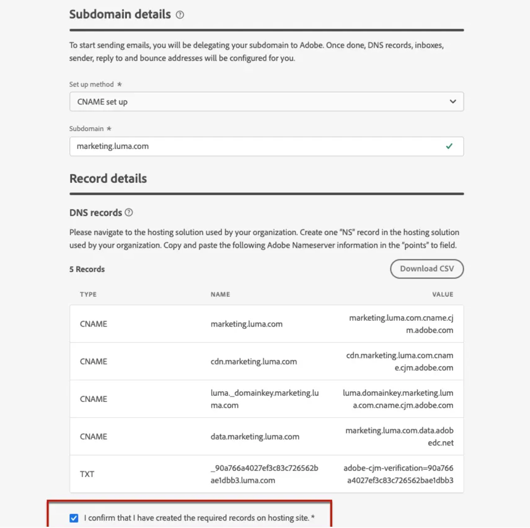 When delegating the subdomain marketing.luma.com using CNAME Delegation, Adobe Journey Optimizer (AJO) provides the following DNS records in the UI: