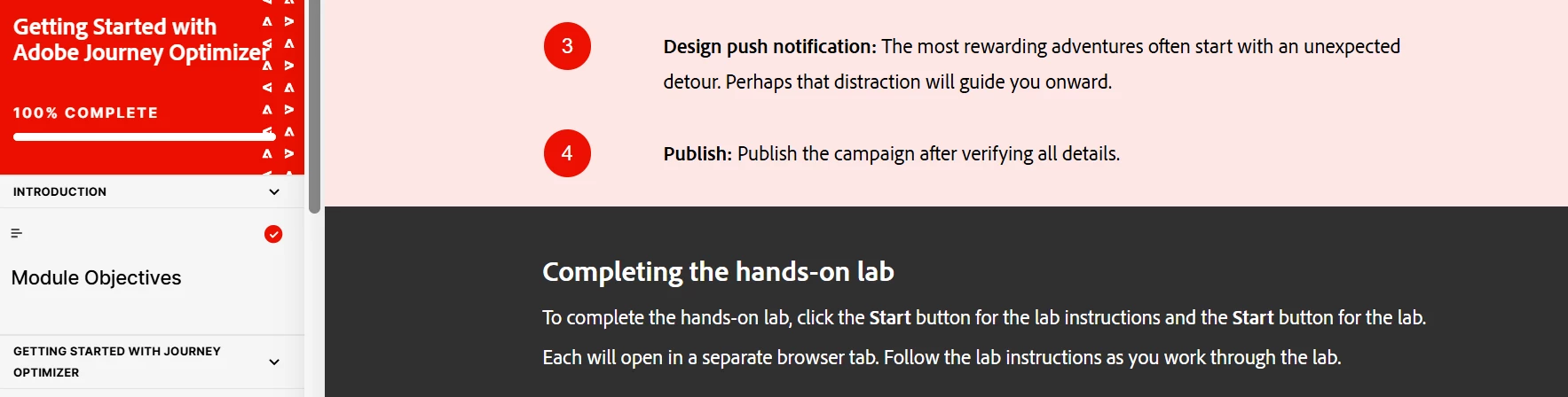 I have started learning Adobe Journey Optimizer and came across hands-on activity in Getting Started module for designing Push campaign. However, there is no "Start" option to launch the same.