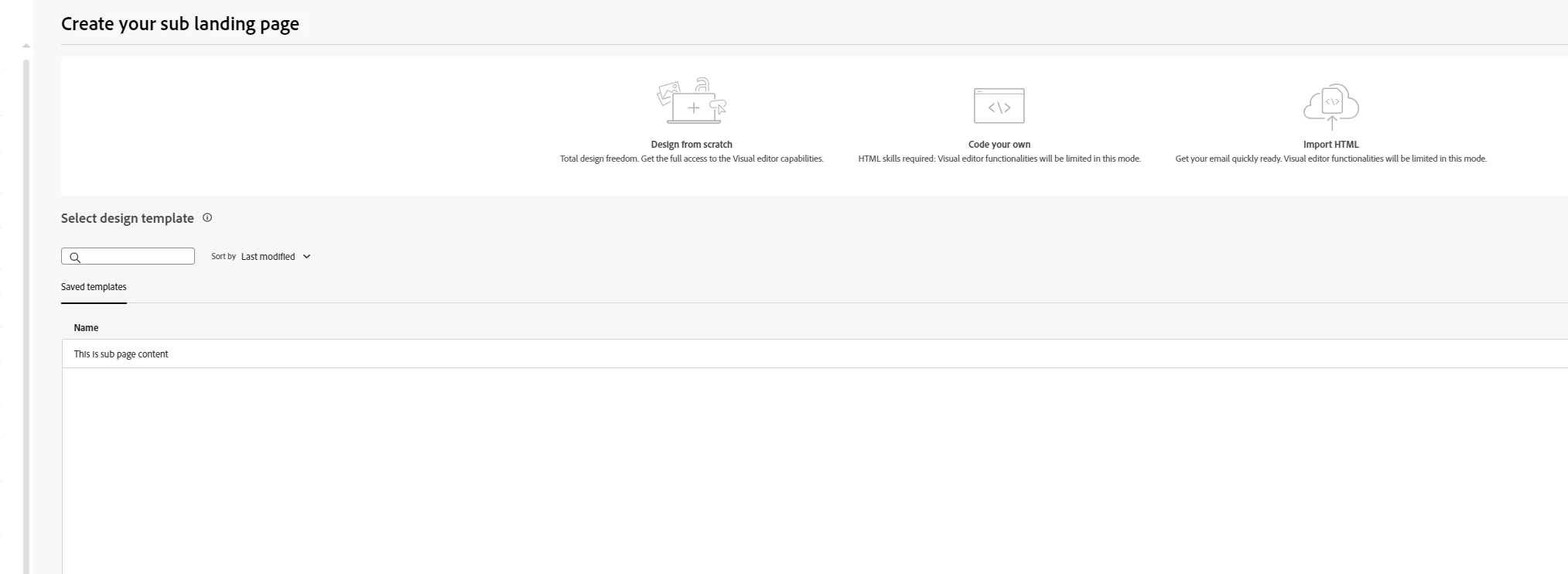 AJO - Creating sub landing pages doesn't allow to select saved templates