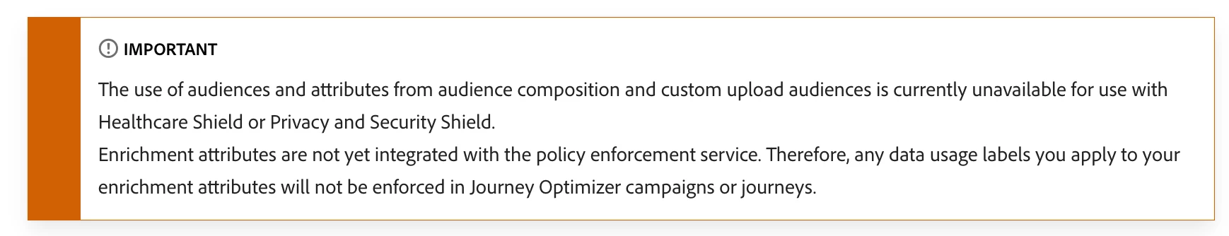 When trying to publish the journey I get the error 'The use of audiences and attributes from Audience Composition and Custom Upload is currently unavailable for use with Healthcare Shield or Privacy and Security Shield.'