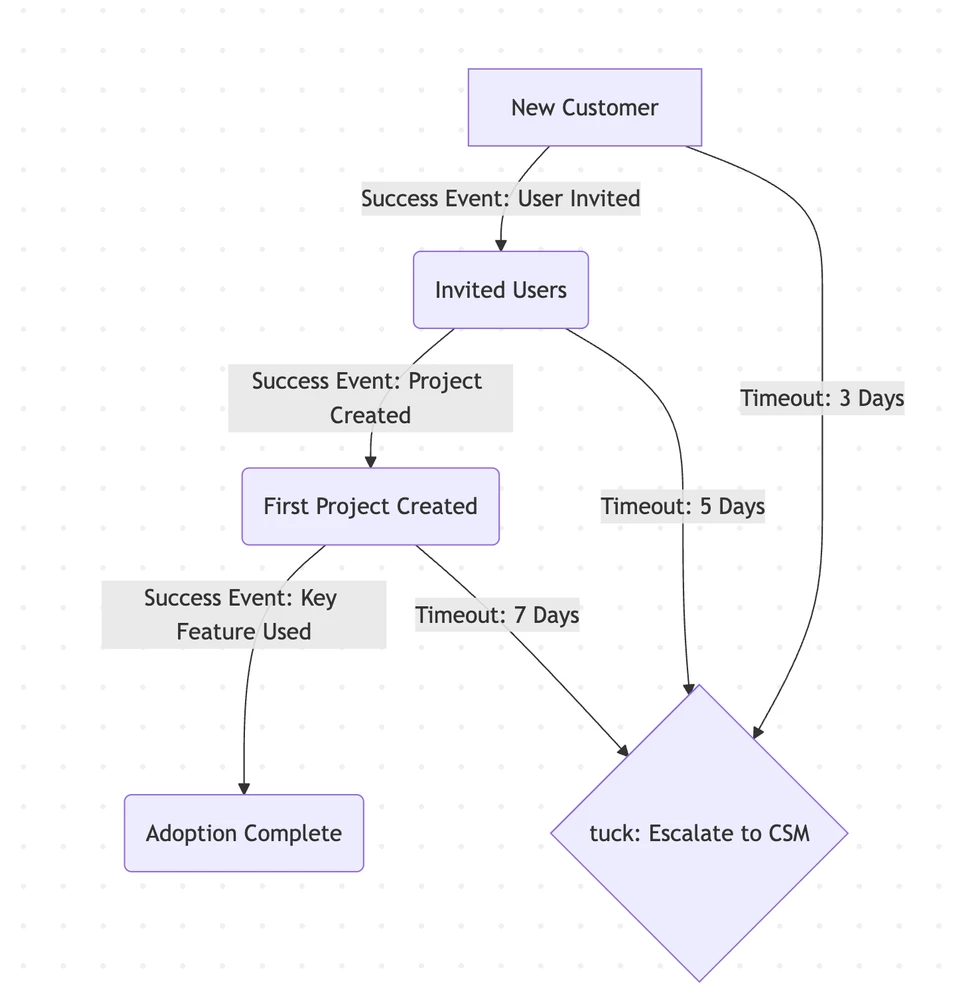 // This logic follows the Timeout path from "ACTIVITY 2" in the Happy Path. // The "Project Created" event was NOT received in 3 days. // --- ACTIVITY 2A: SEND A HELPFUL NUDGE --- ACTION: Send Email SUBJECT: Need a hand starting your first project? BODY: "It looks like you haven't started a project yet. Watch this quick video or book a 15-min call with our onboarding specialist." // --- ACTIVITY 2B: WAIT AGAIN (SHORTER DURATION) --- ACTION: Wait (for Event) EVENT TO WAIT FOR: "Project Created" TIMEOUT: 2 Days // --- ACTIVITY 2C: ESCALATE TO HUMAN INTERVENTION --- // This path is taken if the event is STILL not received after the second wait. ACTION: Update Profile FIELD 1: `onboardingState` = "Onboarding_Stalled" FIELD 2: `healthScore` = `healthScore` - 10 // Decrease the health score ACTION: Custom Action (API Call) SYSTEM: CSM API CALL: POST /tasks PAYLOAD: { "owner": "{{profile.sales.accountOwner}}", "subject": "Onboarding Risk: Customer stuck on project creation", "description": "Automated alert: {{profile.person.name}} from {{profile.b2b.companyName}} has not created a project after 5 days and multiple nudges. Please follow up." } // --- ACTIVITY 3: END OF THIS JOURNEY --- // The customer is now in a "stalled" state and requires human follow-up. ACTION: End