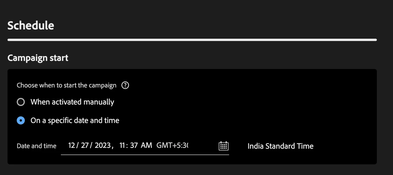 8. Select the on a specific date and time option in the schedule section