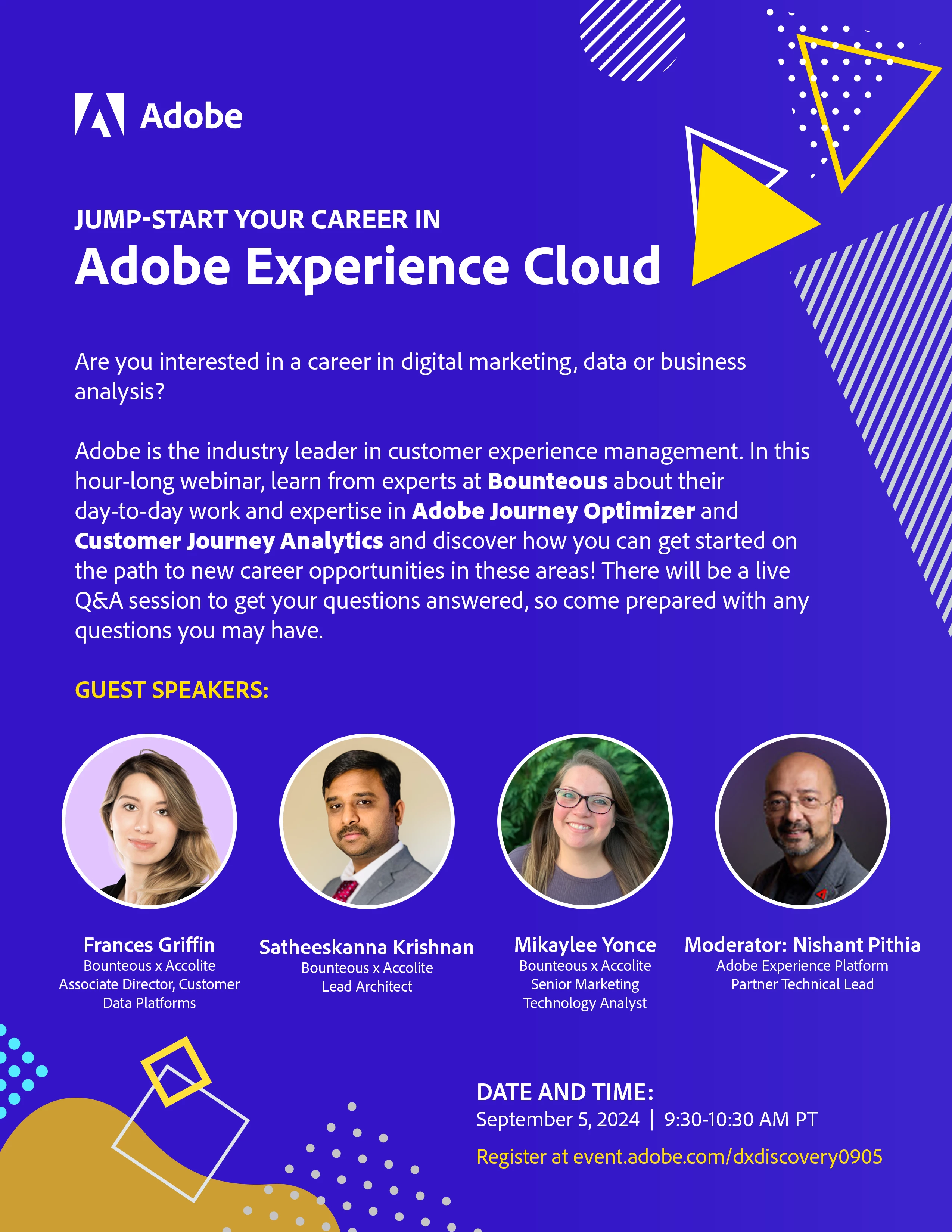 If you're looking to make a shift in your career, or you're a student trying to discover your future career, this panel-styled webinar is for you! Come learn how to break into Adobe Digital Experience, see what type of roles are open in this field and ask questions live to experts in Adobe Journey Optimizer.