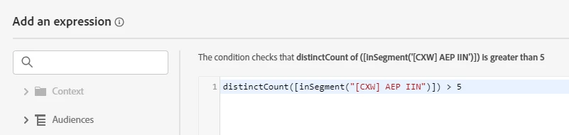 I've tried somethingl like this in journey advanced editor: distinctCount([inSegment("[CXW] AEP IIN")]) > 5 but nothing happens (as my segment has more than 5 profiles)