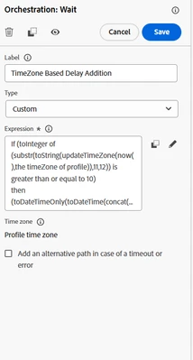 - Code for the wait condition, the if statement check against profile timeZone current hour that it has passed 10 AM in that time zone or not, if true we are adding one more day for scheduling else we do same day scheduling. Note: the return DateTimeOnly is the local time when email be will triggered by AJO.