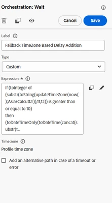 - Code for the wait condition, the second wait if statement check against fallback time zone (this should be same as journey timeZone, please check the hard code vlaue of "Asia/Calutta") current hour that it has passed 10 AM in that time zone or not, if true we are adding one more day for scheduling else we do same day scheduling.