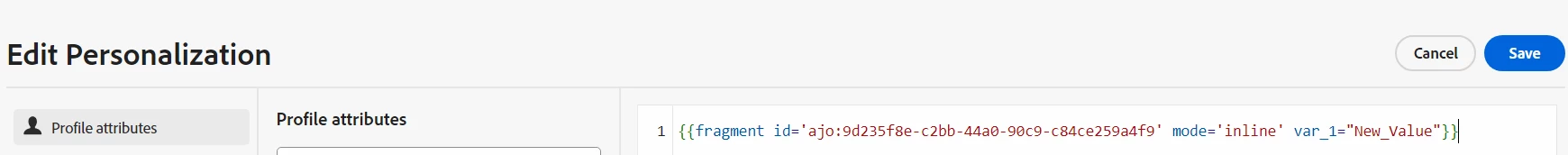 "{{fragment id='ajo:1f0cd758-e1d5-4034-ba12-d69375018103' mode='inline' var_1='New_Value'}}{{var_1}}". I want the default value "Value_1" to be replaced with "New_Value"; which is not working and giving me the default value "Value_1" instead. Also, popping up a message: